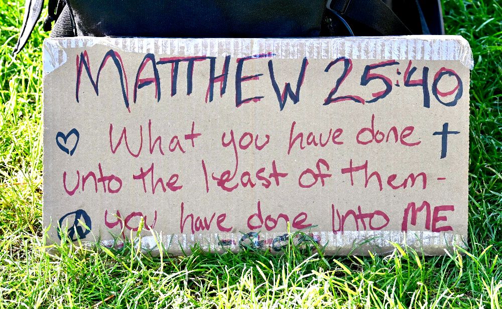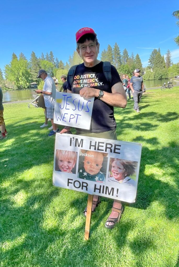Most of the time, I take the photos. I’m rarely in them. This time, at the Bend NO MORE KING protest, we ran into a friend, Laurie. We were carrying our signs and she had a sign. She wanted to get a shot of me with all our signs and slogans. So here I am, covered head to toe in the message from my MAGA (Make America Greta Again) cap down to my “Do justice, love mercy, walk humbly” shirt. The sign I carry at all events tells why Debbie and I show up: “I’m here for him!” We hang out with 4,000 of our best Bend friends for all the grandchildren of Earth, yes including this 7-year-old privileged white one. Laurie was carrying “Jesus Wept.” She added her message to ours. It’s how we roll, joining our voices. John 11:35 says “Jesus Wept” (a silent weeping) when he showed up to find his dear friend Lazarus had died and he was too late to do anything about it. In Luke Jesus weeps over Jerusalem saying: “Would that even today you knew the things that make for peace but they are hid from your eyes.” Jesus moves from this moment of compassion directly to the temple, over-turning the tables of money changers turning profits off the misery of the disinherited. Compassion can mingle with righteous anger. Tears with liberating action. When we care about stuff, we cry out somehow. Josephus, a prime historian in Jesus’ time, reported that within a few years of Luke’s words being written, an estimated 600,000 to 1.1 million people were massacred in the Roman siege of Jerusalem in 70AD. Most were non-combatants, women and children (where have we heard this before?). They didn’t teach this in my Sunday School. Just like they didn’t teach about lynching in American History. They say history never actually repeats itself but it rhymes. No wonder Jesus wept. And why wouldn’t we?
