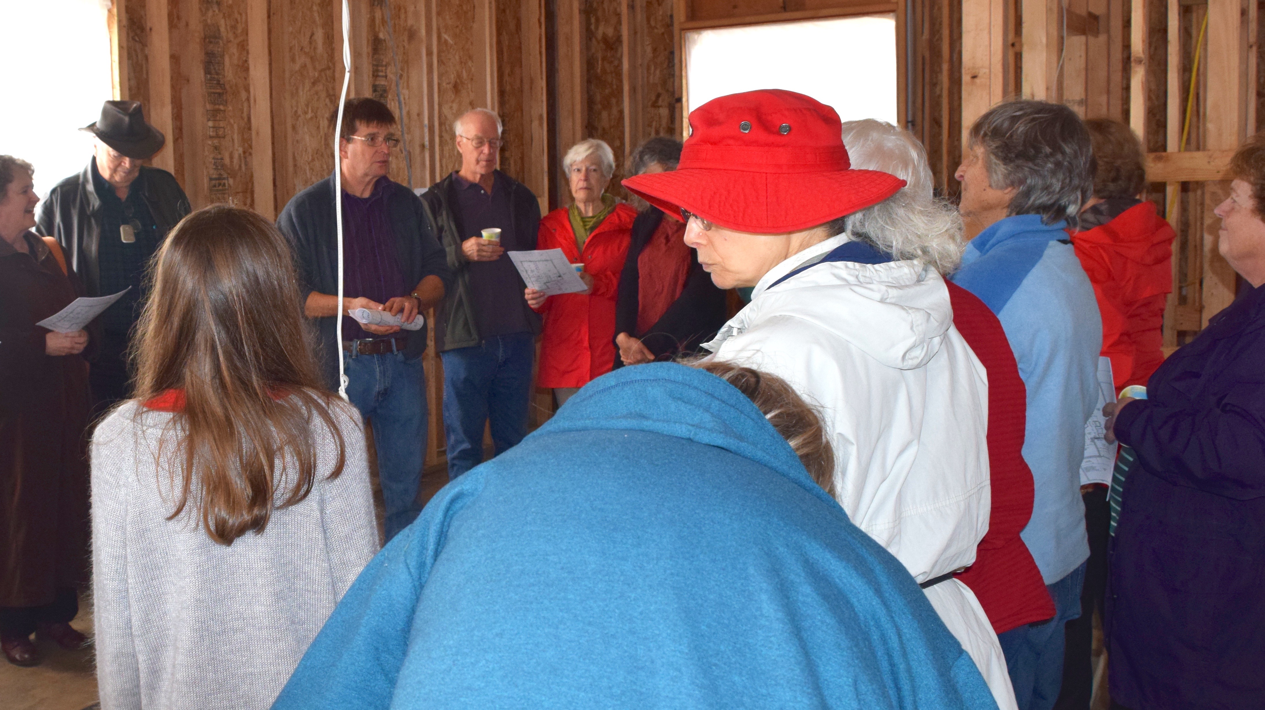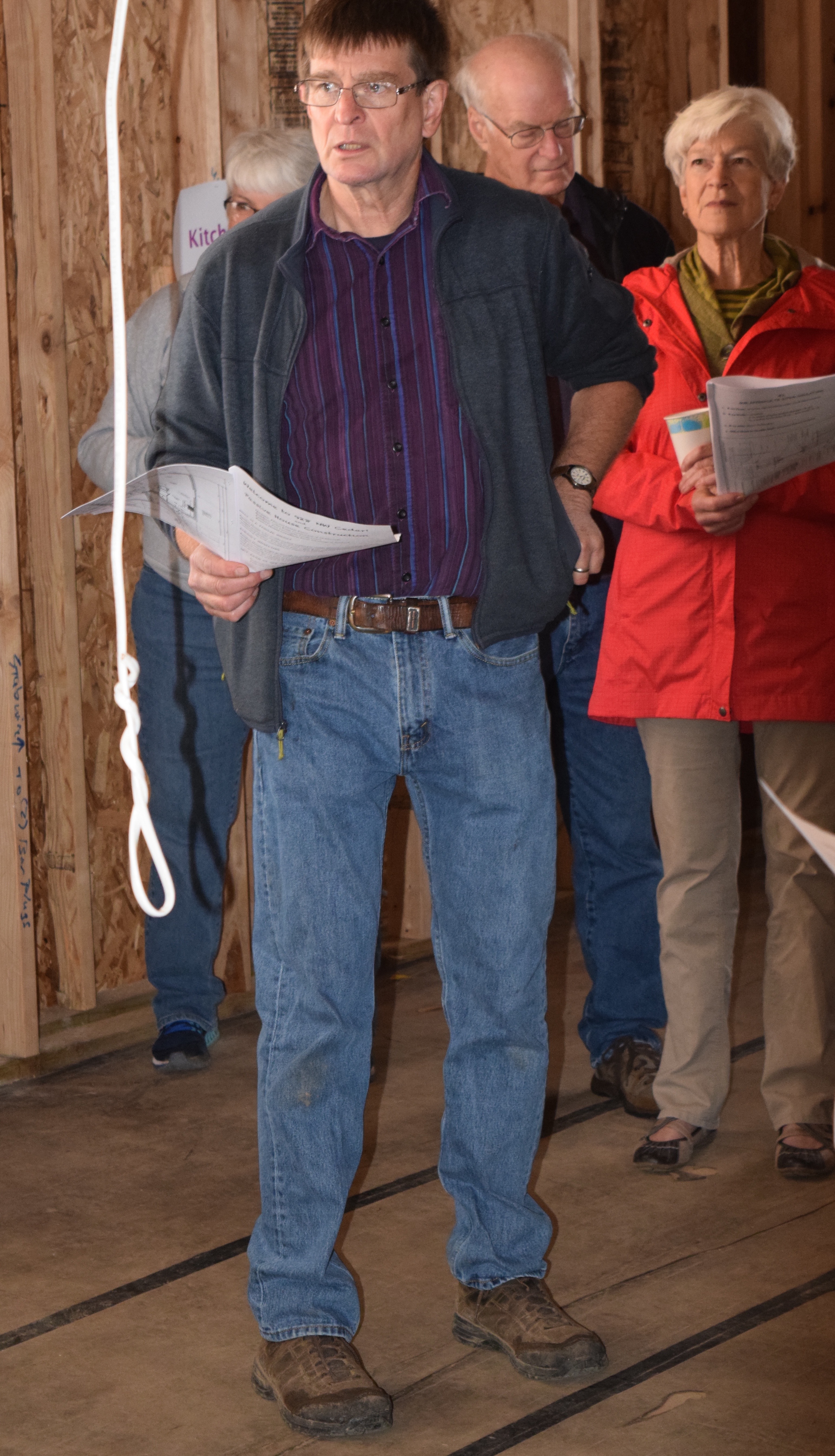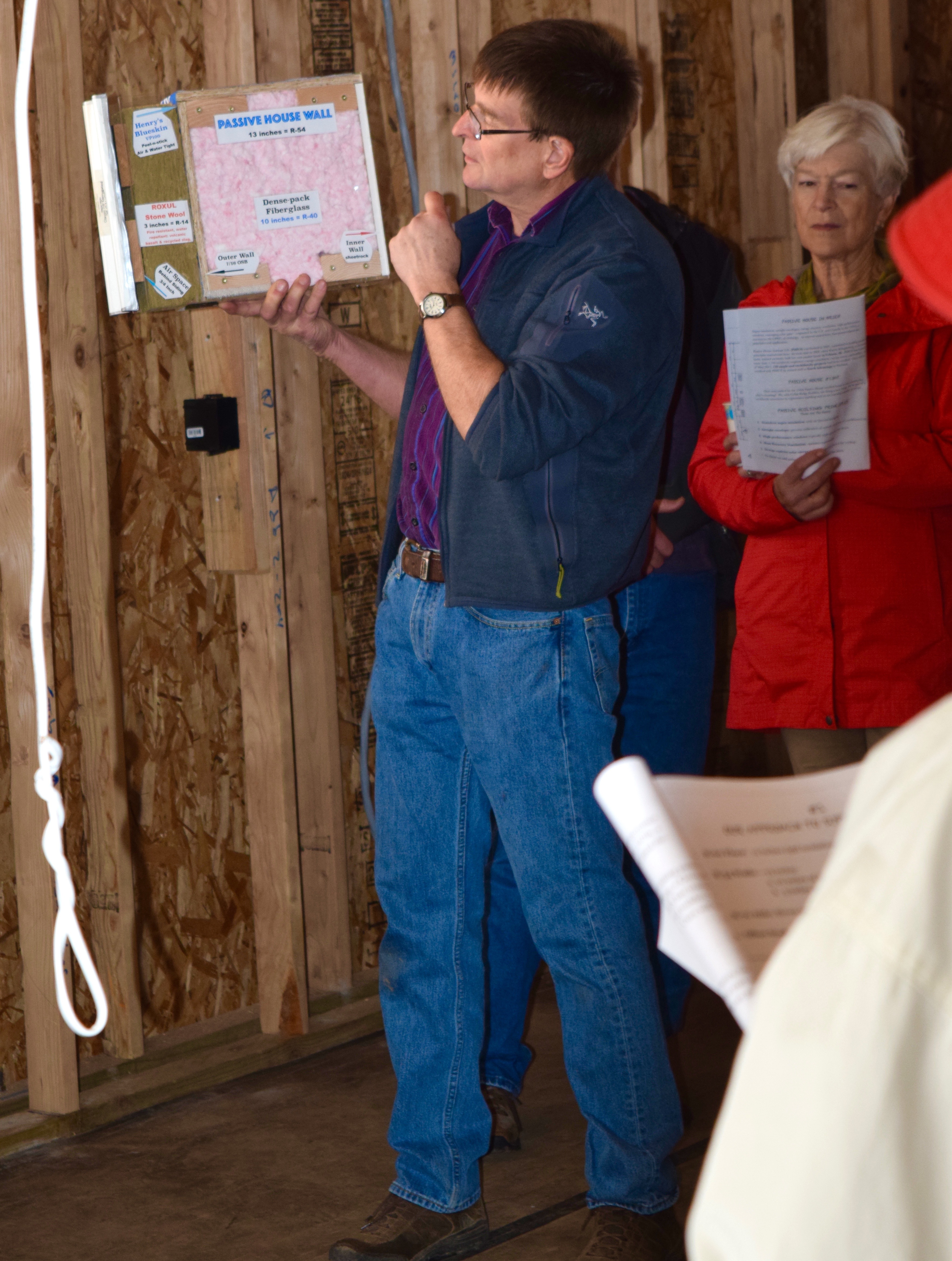 At 3 o’clock Debbie sounded one of her characteristic two-fingered whistle and we gathered around so I could preach awhile…I know, I’m retired, but it’s still an occupational hazard. We had assembled a booklet, a kind of tour guide for understanding Passive House. We walked through it briefly together and entertained more questions. The woman in red is my sister Alice, listening intently. I’m not sure of the origin of her dismayed expression. Perhaps it was the question about how many minutes of Pilates one would have to limit oneself to doing on a cold winter morning, so as not to overheat the airtight envelope! Just sayin’.